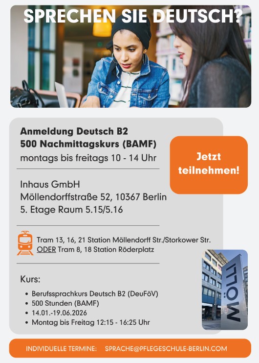 Der Kurs findet in Präsenz in der Möllendorffstr. 52, Etage 5 ab dem 14.01.2026 bis zum 19.06.2026 montags-freitags von 12:15 Uhr bis 16:25 Uhr bei der INHAUS GmbH statt. Die Anmeldung erfolgt um 12:00 Uhr im Raum 5.15. Eine Teilnahme ist möglich, wenn Sie arbeiten, eine Ausbildung machen oder suchen, arbeitsuchend gemeldet sind oder Leistungen vom Jobcenter erhalten.